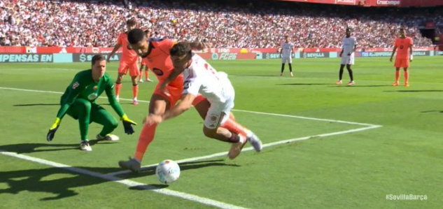 V 10. minúte stretnutia po vhadzovaní došlo k súboju o loptu medzi Isaacom Romerom a Ronaldom Araujom. Obaja sa navzájom strkali, no tesne pred bránkovou čiarou sa im zamotali nohy, čo spôsobilo pád útočníka Sevilly. Rozhodca situáciu skontroloval na VAR a nariadil pokutový kop.