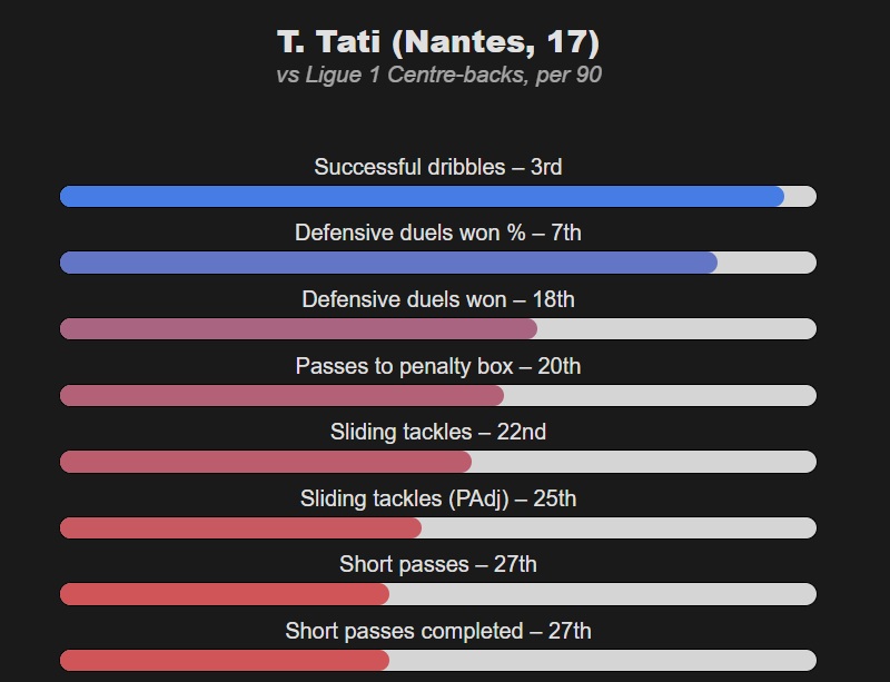 Podľa novinára denníka Sport chce Tati stráviť túto sezónu v Nantes a až v lete by si mohol vypočuť ponuky. Jeho kontrakt s klubom platí do 30. júna 2028. Sedemnásťročný obranca je charakterizovaný ako fyzicky silný hráč (meria 192 cm), ktorý vie bojovať vo vzduchu, je rýchly a dobre rozohráva loptu. Nižšie sú uvedené niektoré Tatiho štatistiky z portálu DataMB.