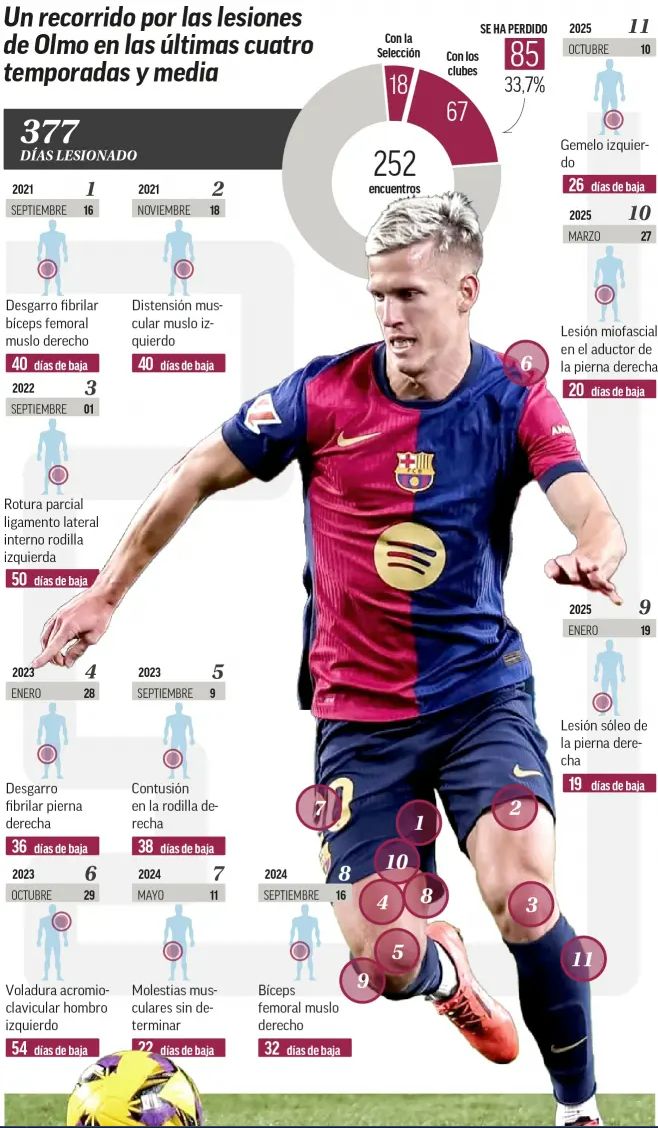 Celkovo Olmo utrpel 11 rôznych zranení počas štyroch a pol sezóny, čo ho vyradilo na 377 dní – viac ako rok aktívnej kariéry. Teraz opäť vypadne z hry na niekoľko týždňov a určite príde o El Clásico, ktoré je na programe 26. októbra.