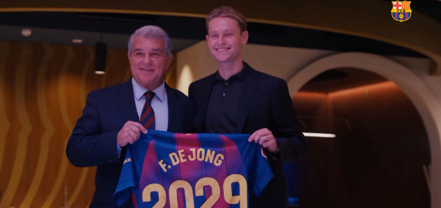 "De Jong po tréningu odišiel do kancelárie, aby podpísal zmluvu, ktorá posilňuje jeho úlohu v plánoch Hansiho Flicka. Na slávnosti sa zúčastnili prezident FC Barcelona Joan Laporta, prvý viceprezident Rafael Yuste, člen predstavenstva Joan Soler, futbalový riaditeľ Anderson Luis de Souza 'Deco', futbalový koordinátor Bojan Krkić a ďalší členovia športového výboru," píše klub.