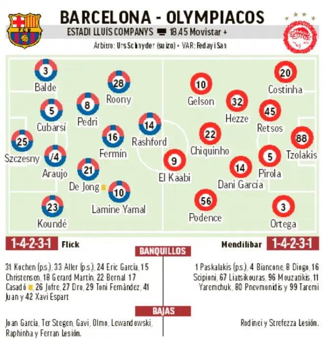 Grécky majster vstúpil do Ligy majstrov remízou s Pafosom a prehrou s Arsenalom, takže dnes potrebuje bodovať. Tréner José Luis Mendilibar, ktorý už v minulosti čelil Barcelone ako kouč LaLigy, vie, že šance jeho tímu sú malé, no sľubuje odvážny futbal: „Ak sa stiahneme, len preto, že nás k tomu Barça donúti. Naším cieľom je ísť dopredu.“