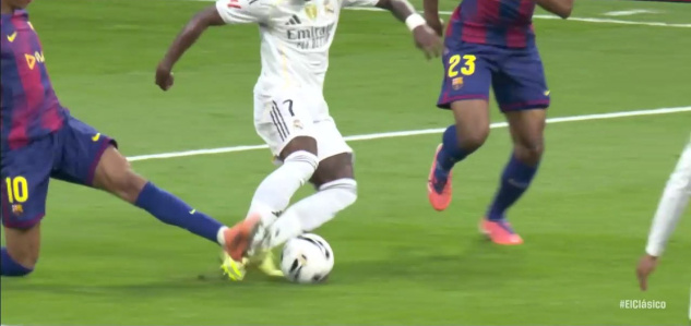 "Na začiatku zápasu hráč Realu Madrid [Vinícius] vbieha do pokutového územia, zatiaľ čo hráč Barcelony [Lamine Yamal] ho nasleduje. Obranca Barcelony predbehne svojho súpera, získa lepšiu pozíciu a má možnosť prebrať loptu. Keď položí nohu na zem, útočník Realu Madrid ho kopne pri pokuse o strelu. Akcia sa odohráva veľmi rýchlo a rozhodca ju vyhodnotí opačne, keď ukazuje na pokutový kop pre Real Madrid."