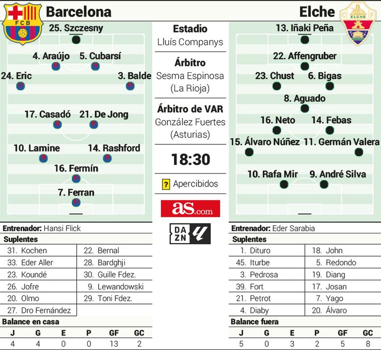 Elche prichádza bez jedinej absencie, v zápase nebude mať čo stratiť a Eder Sarabia pozná prostredie Barcelony až príliš dobre. Jeho štýl je odvážny, dominantný na lopte a Elche je jedným z príjemných prekvapení ligy, aj napriek poslednej sérii výsledkov (1 bod z 9).