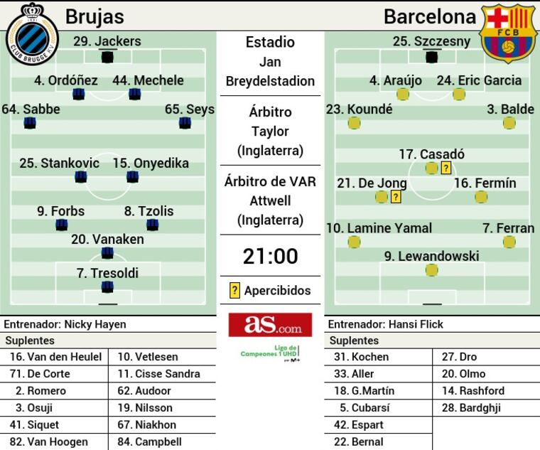 Barcelona: Szczęsny; Koundé, Pau Cubarsí, Eric García, Balde; De Jong, Marc Casadó; Lamine Yamal, Fermín López, Rashford; Lewandowski.