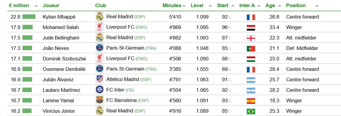 Kylian Mbappé vedie rebríček s odhadovaným ročným hrubým platom vo výške 22,8 milióna eur (fixná časť). Táto suma je o 40% nižšia ako jeho skutočný príjem. Mohamed Salah a Jude Bellingham dopĺňajú pódium hráčov, ktorí si podľa modelu „zaslúžia“ najvyššie platy.