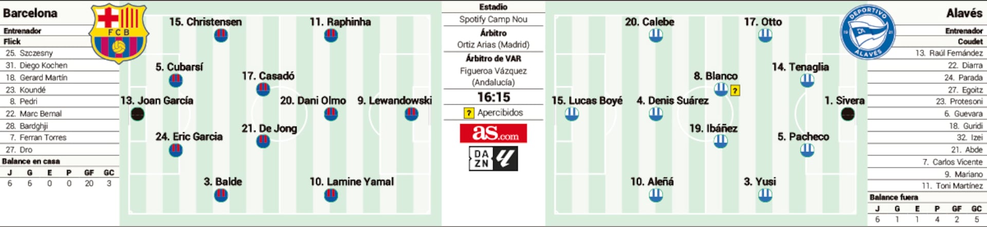 Barcelona: Joan García; Koundé, Cubarsí, Christensen, Balde; De Jong, Eric García; Lamine, Olmo, Raphinha; Lewandowski.