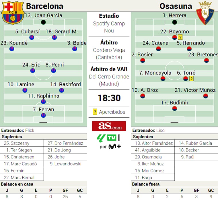 A Osasuna neprichádza v ideálnej pozícii. Tím Alessia Lisciho je najhorším hosťujúcim mužstvom LaLigy. V ôsmich zápasoch vonku získal len dva body a zvyšok premenil na šesť prehier. Navyše, na pôde Barcelony Osasuna dlhodobo neuspela – päť prehier v rade so skóre 0:19 je výpovedný údaj.