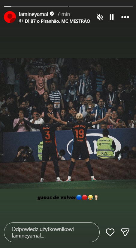 Lamine zverejnil na Instagrame fotku, na ktorej oslavuje gól strelený na RCDE Stadium v zápase, ktorý v minulej sezóne spečatil španielsky titul: "Nemôžem sa dočkať návratu," napísal 18-ročný mladík s ironickými emotikonmi.