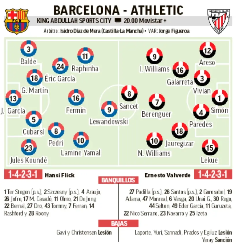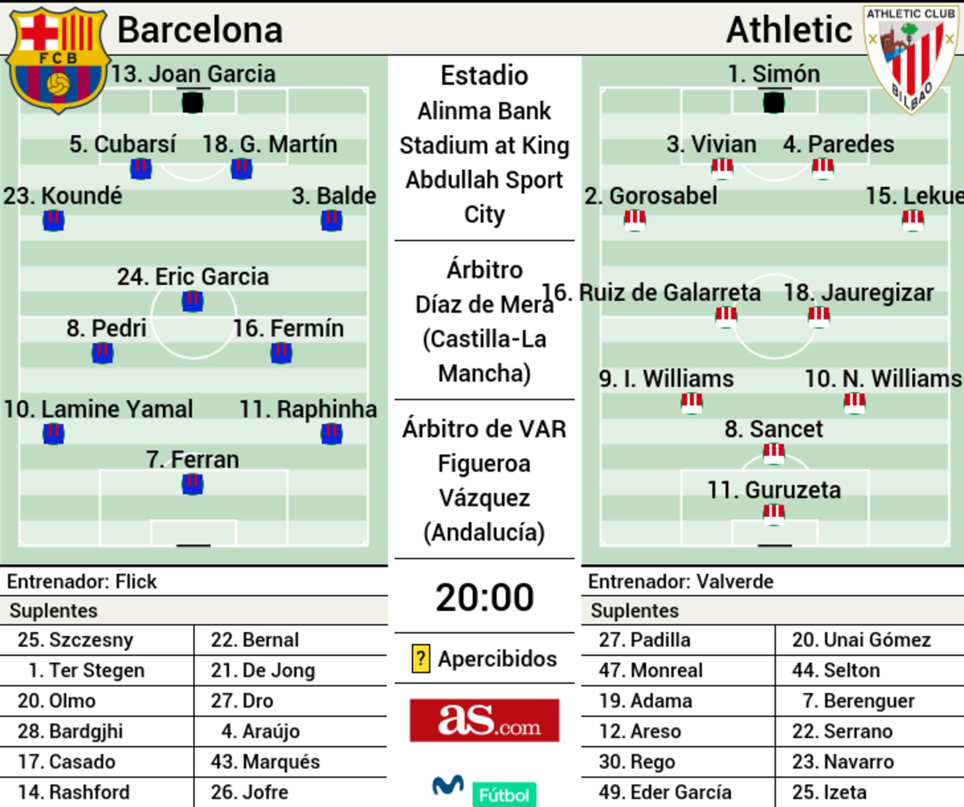 Barça: Joan Garcia; Koundé, Pau Cubarsí, Gerard Martín, Balde; Eric Garcia, Pedri, Fermín; Lamine Yamal, Lewandowski y Raphinha.