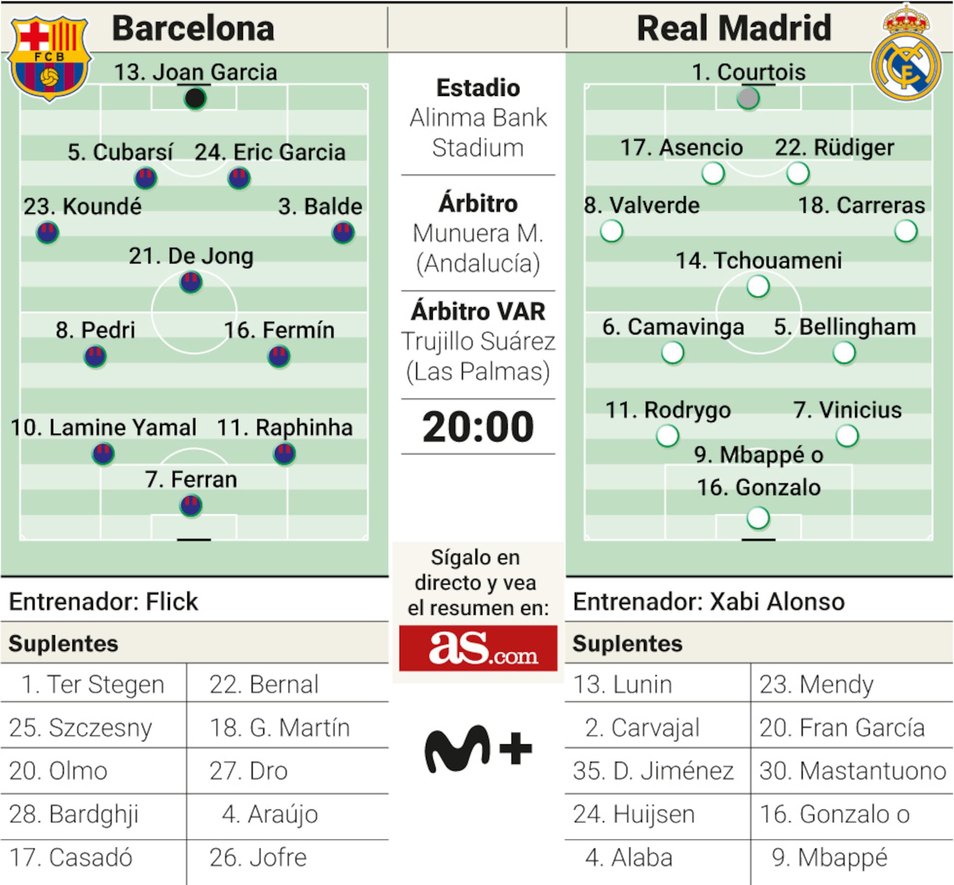 FC Barcelona: Joan Garcia; Balde, Eric Garcia, Cubarsí, Koundé; De Jong, Pedri, Fermín; Raphinha, Ferran Torres a Lamine Yamal.