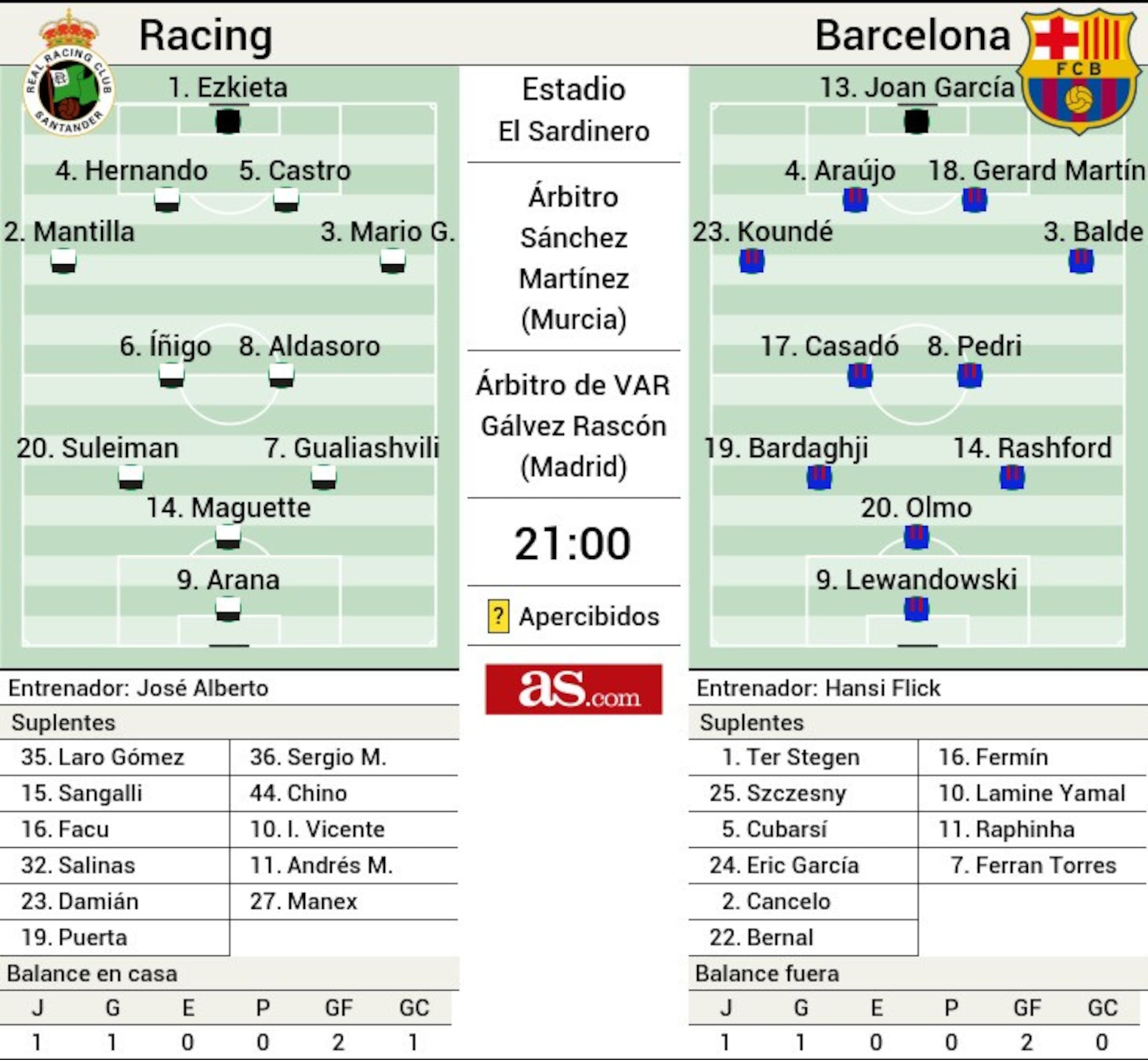 Dnešný zápas bude mať špeciálnu príchuť pre Marca Bernala. Pre 18-ročného mladíka, o ktorého sa intenzívne zaujíma Girona, môže byť počet odohraných minút v Santanderi rozhodujúcim faktorom. Ak ho Flick postaví do základu a dá mu dôležitú rolu, je pravdepodobné, že náš talent zostane v klube. V opačnom prípade sa dvere k hosťovaniu otvoria dokorán.