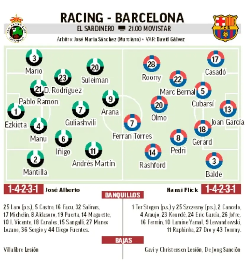 Domáci čakali na súboj s Barcou viac ako desať rokov. Hoci je pre nich prioritou postup do prvej ligy, skalp Barcelony na vypredanom El Sardinero by bol historickým momentom. Racing hrá atraktívny futbal a víťazstvo nad Villarrealom (2:1) je pre nás dostatočným varovaním. Domáci tréner José Alberto má k dispozícii takmer kompletný káder, chýbať mu bude len zranený Villalibre.