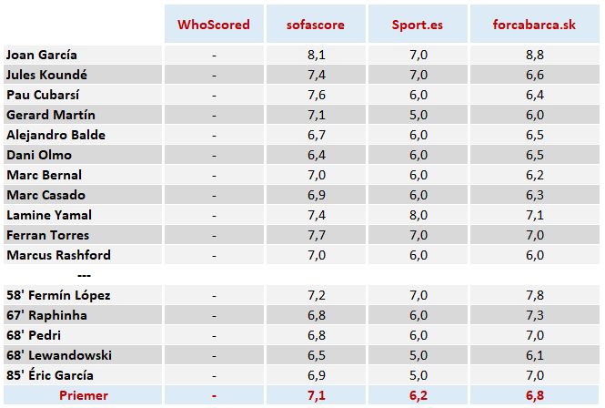 Hodnotenie hráčov bolo zostavené podľa nasledovného kľúča -> do úvahy sme brali 2 subjektívne zdroje: hodnotenie komunity forcabarca.sk a hodnotenie katalánskeho denníka Sport a potom hodnotenie sofascore.com. Pri každom hráčovi je priemer známok z týchto 3 zdrojov s komentárom katalánskeho denníka Sport.