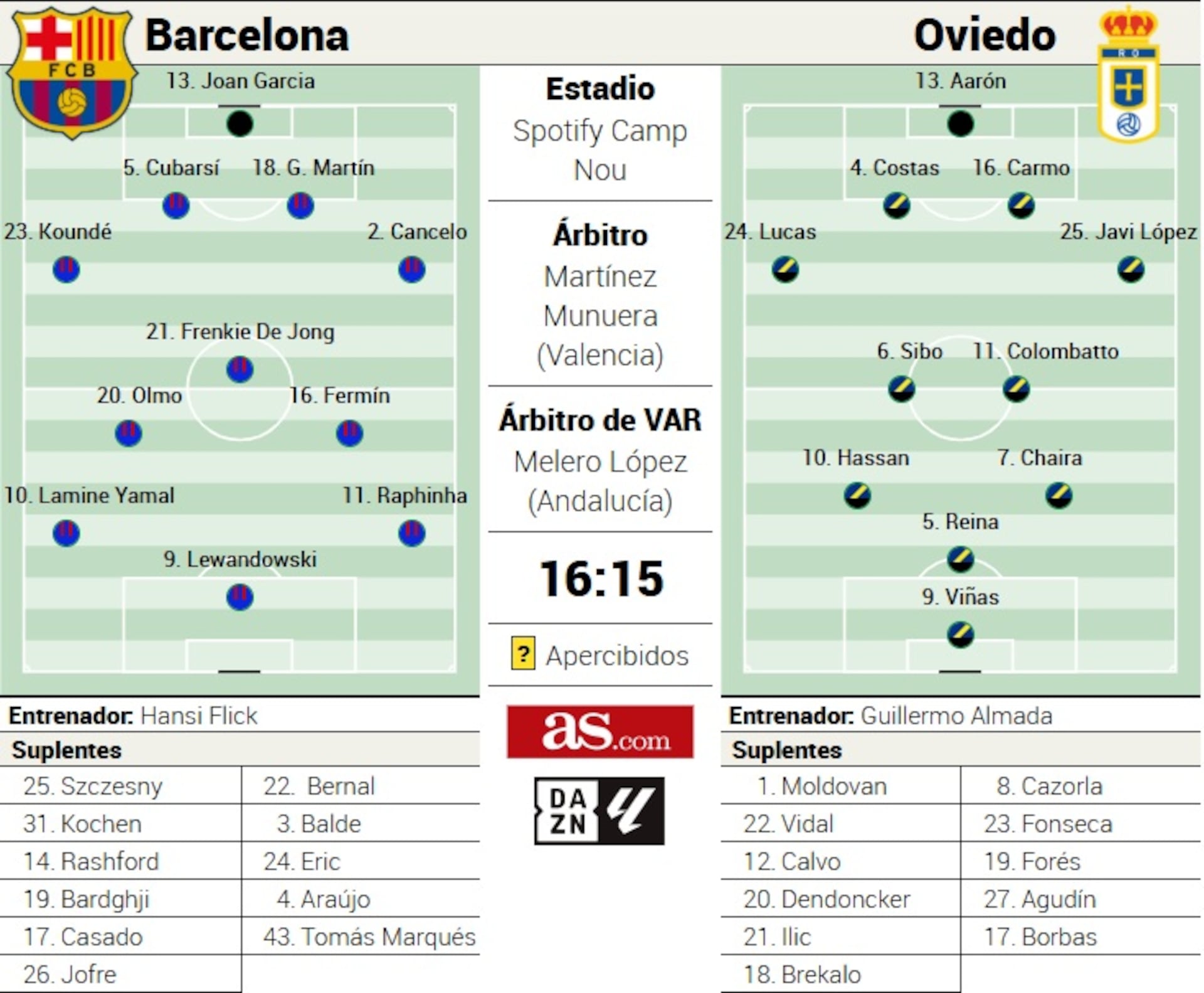 FC Barcelona: Joan Garcia; Balde, Eric, Cubarsí, Kounde; Frenkie, Olmo, Fermín; Raphinha, Lewandowski a Lamine Yamal.