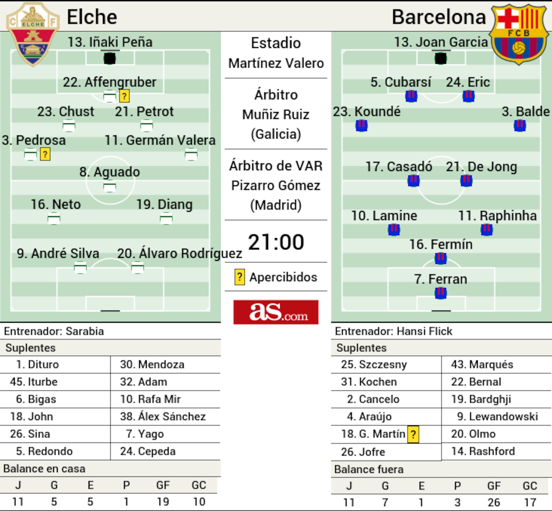 Barcelona: Joan García; Koundé, Cubarsí, Gerard Martín, Balde; De Jong, Casadó; Lamine Yamal, Olmo, Raphinha; Ferran