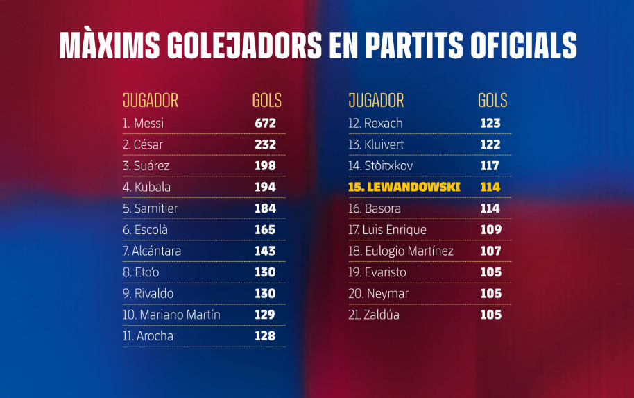 Od gólu číslo 1 na Anoeta 21. augusta 2022 strelil Lewy ďalších 113 gólov, vďaka čomu sa zapísal do histórie klubu. Vstupom do prvej pätnástky sa Lewandowski vyrovnal Estanislauovi Basorovi, ktorý hral v FC Barcelona v rokoch 1946 – 1958. V tejto sezóne už predbehol iných bývalých hráčov Barçy, ako sú Neymar Jr. a Luis Enrique.