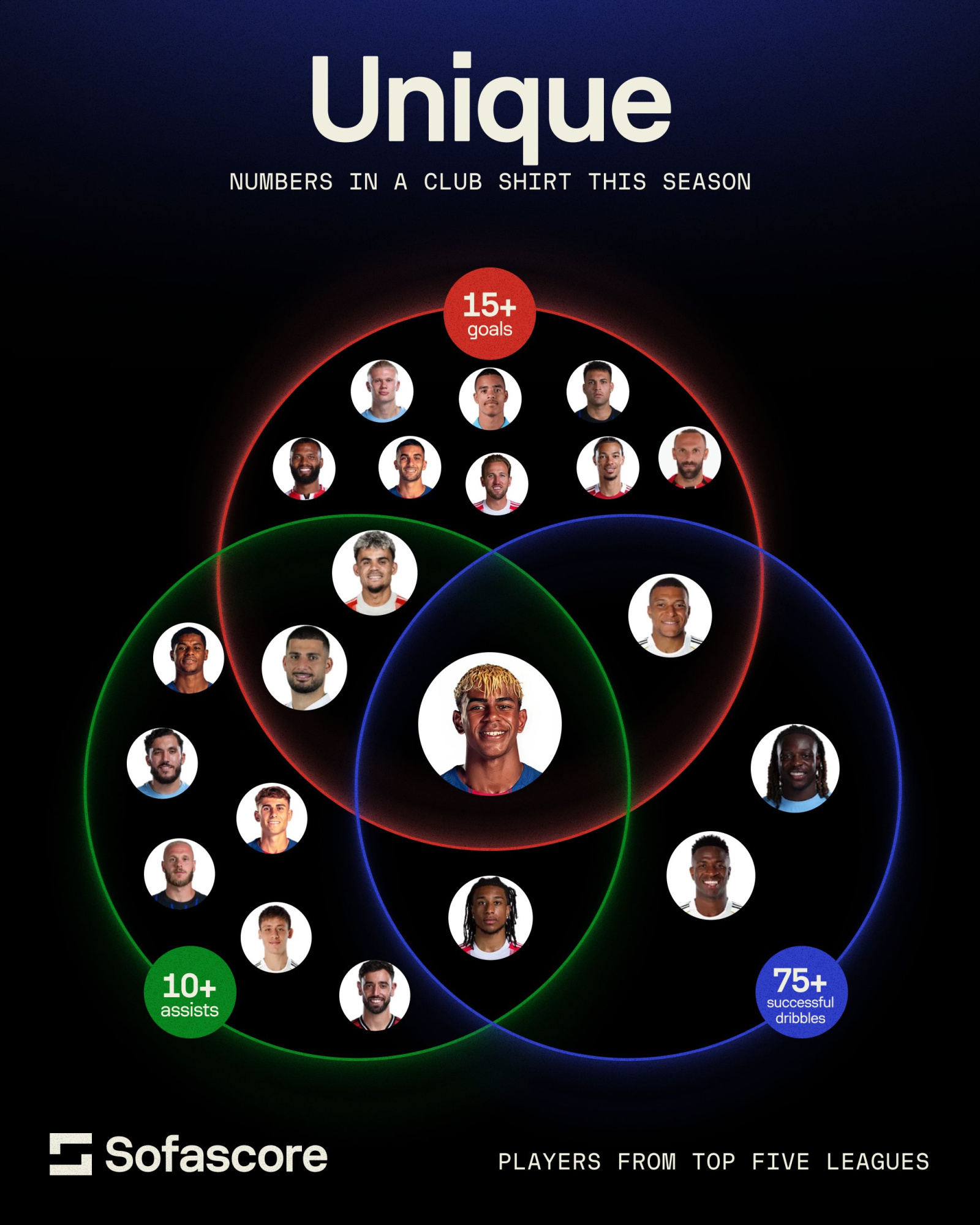 Samostatné štatistiky nestačia na to, aby vyjadrili plný vplyv hráča na ofenzívnu hru. Jedna z analýz založených na údajoch z prebiehajúcej sezóny ukazuje, aké vzácne je súčasné spájanie gólov, asistencií a efektívneho driblingu. V tomto rebríčku obzvlášť vyniká Lamine Yamal.