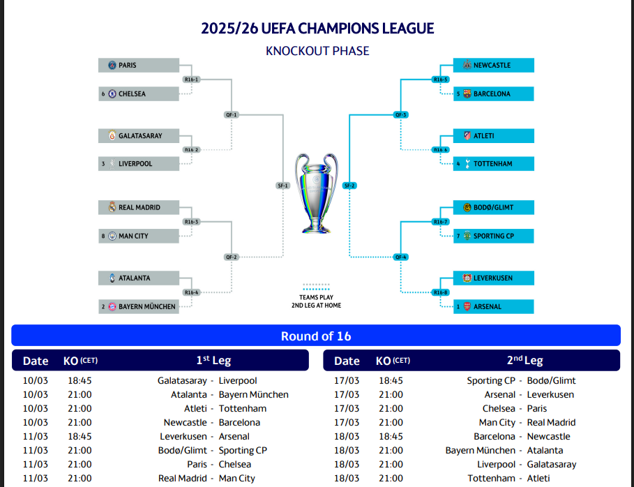 Prvý zápas osemfinále Ligy majstrov medzi Barcelonou a Newcastle na St. James' Park je naplánovaný na utorok 10. marca o 21:00. Odveta na Spotify Camp Nou sa naopak uskutoční v stredu 18. marca o 18:45.