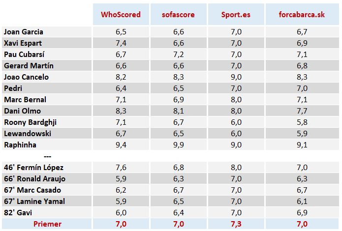 Hodnotenie hráčov bolo zostavené podľa nasledovného kľúča -> do úvahy sme brali 2 subjektívne zdroje: hodnotenie komunity forcabarca.sk a hodnotenie katalánskeho denníka Sport a potom hodnotenie dvoch štatistických portálov Whoscored.com a sofascore.com. Pri každom hráčovi je priemer známok z týchto 4 zdrojov s komentárom katalánskeho denníka Sport.