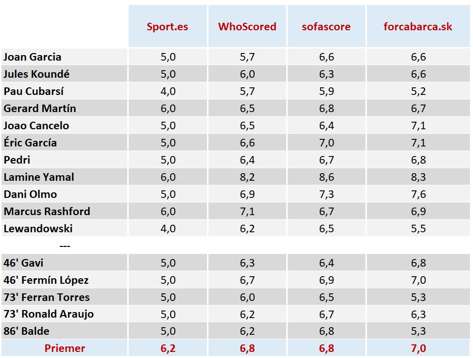 Hodnotenie hráčov bolo zostavené podľa nasledovného kľúča -> do úvahy sme brali 2 subjektívne zdroje: hodnotenie komunity forcabarca.sk a hodnotenie katalánskeho denníka Sport a potom hodnotenie dvoch štatistických portálov Whoscored.com a sofascore.com. Pri každom hráčovi je priemer známok z týchto 4 zdrojov s komentárom katalánskeho denníka Sport.