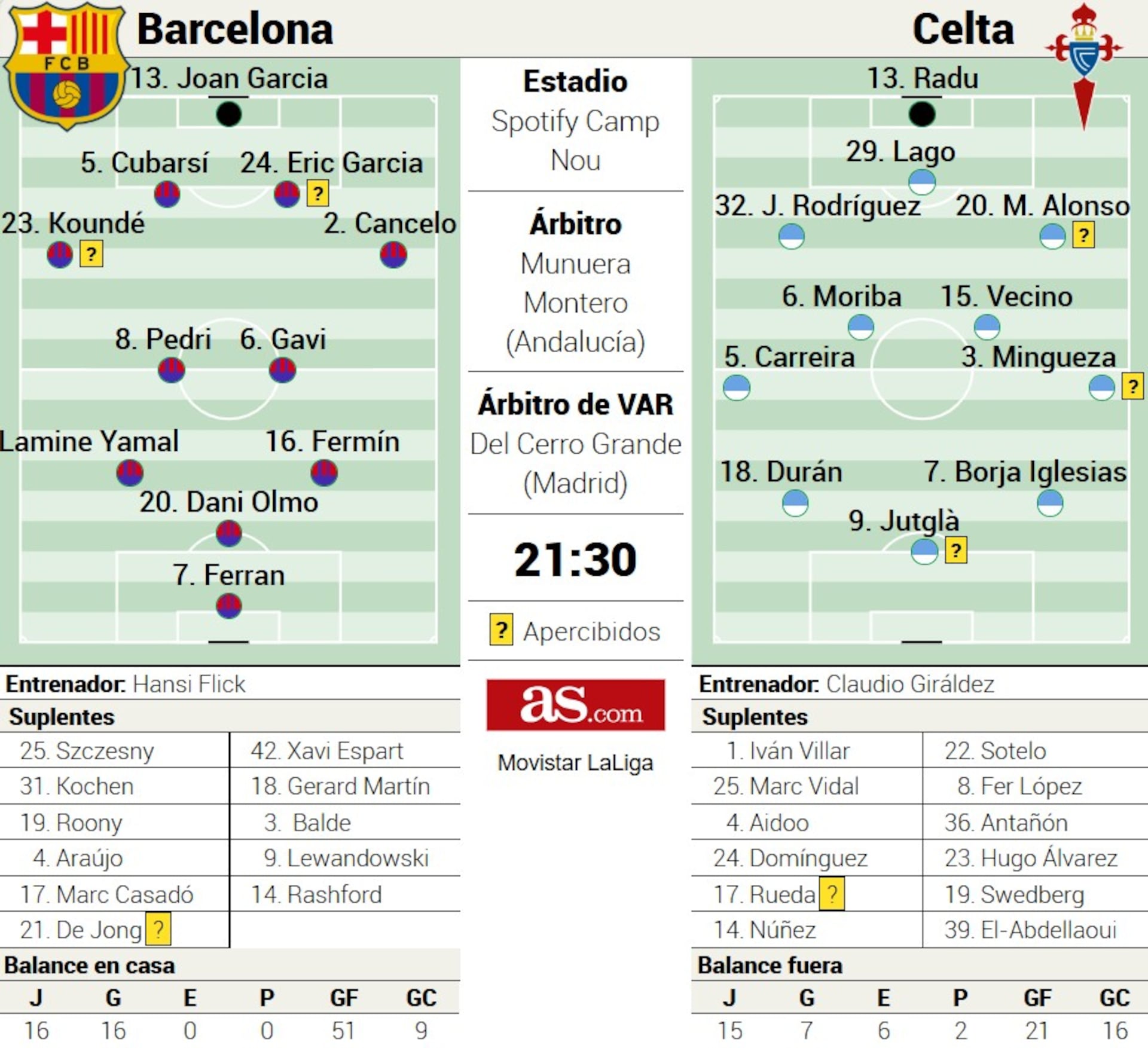 Barcelona: Joan García; Koundé, Eric García, Cubarsí, Cancelo; Pedri, De Jong; Lamine, Olmo, Fermín; Ferran Torres.