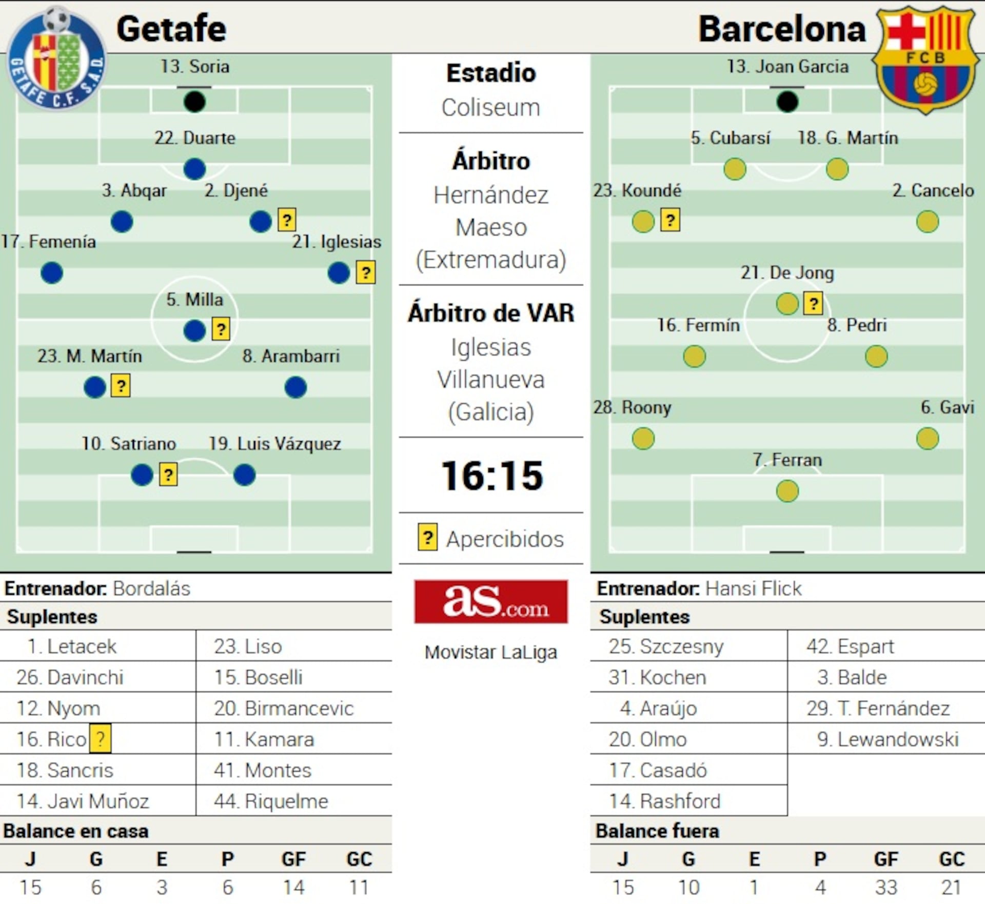 Getafe: David Soria; Kiko Femenia, Baselli, Abqar, Duarte, Juan Iglesias; Djené Luís Milla, Arambarri; Luis Vázquez a Martín Satriano.