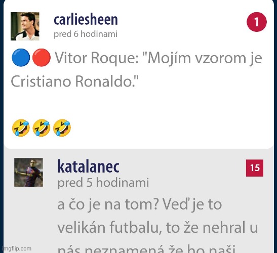 ze ty potrebujes hned do chalana dzubat za jeho nazor a otacat to na to, ci musi byt jeho vzorom len sucansny / byvaly hrac Barcelony...ze ci to nemusi byt jeden z najlepsich hracov (co tiez nemusi byt chalanov nazor, je CR7 je jeden z naj hracov sveta...) chces byt nasilu chrumkavy, to je ten point